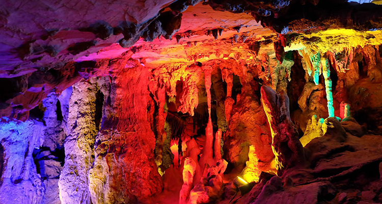 亮點:喀斯特溶洞,鐘乳石千姿百態(tài),燈光映襯下如夢如幻。