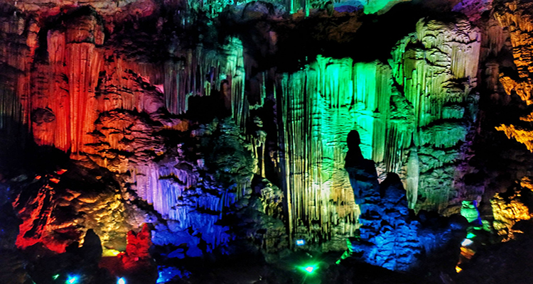 一個巨大的喀斯特溶洞,位于湖心島上。洞內(nèi)空間開闊,鐘乳石形態(tài)各異,在五彩燈光的映襯下,呈現(xiàn)出光怪陸離的景象,仿佛進入了一個神秘的地下世界。洞內(nèi)還有地下河,河水清澈見底。需乘船抵達島上,游覽時間約 1 小時,參觀時需跟隨導(dǎo)游,注意安全。