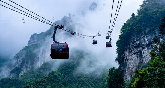 天門山索道全長7455米,水平高差1279米,沿線盡為絕壁天險,氣勢沖天,是世界上最為壯觀的索道之一。它以張家界市中心城市花園為起點,經(jīng)民間田園風光而達山頂?shù)脑伎罩谢▓@,猶如一道彩虹飛渡“人間”“天上”。