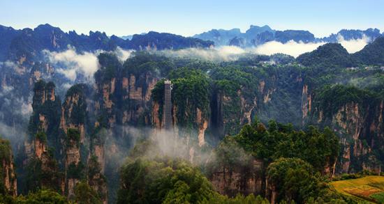 站在袁家界景區(qū)的觀景臺(tái)上,三千奇峰盡收眼底,雄險(xiǎn)秀野,神態(tài)各異。峽谷深處,千百根石峰石柱奇?zhèn)ネ涣?。峻峭之石,如英武將帥;嵯峨之峰,似勇猛壯士。有聲有色,若靜若動(dòng),形象逼真,呼之欲出。